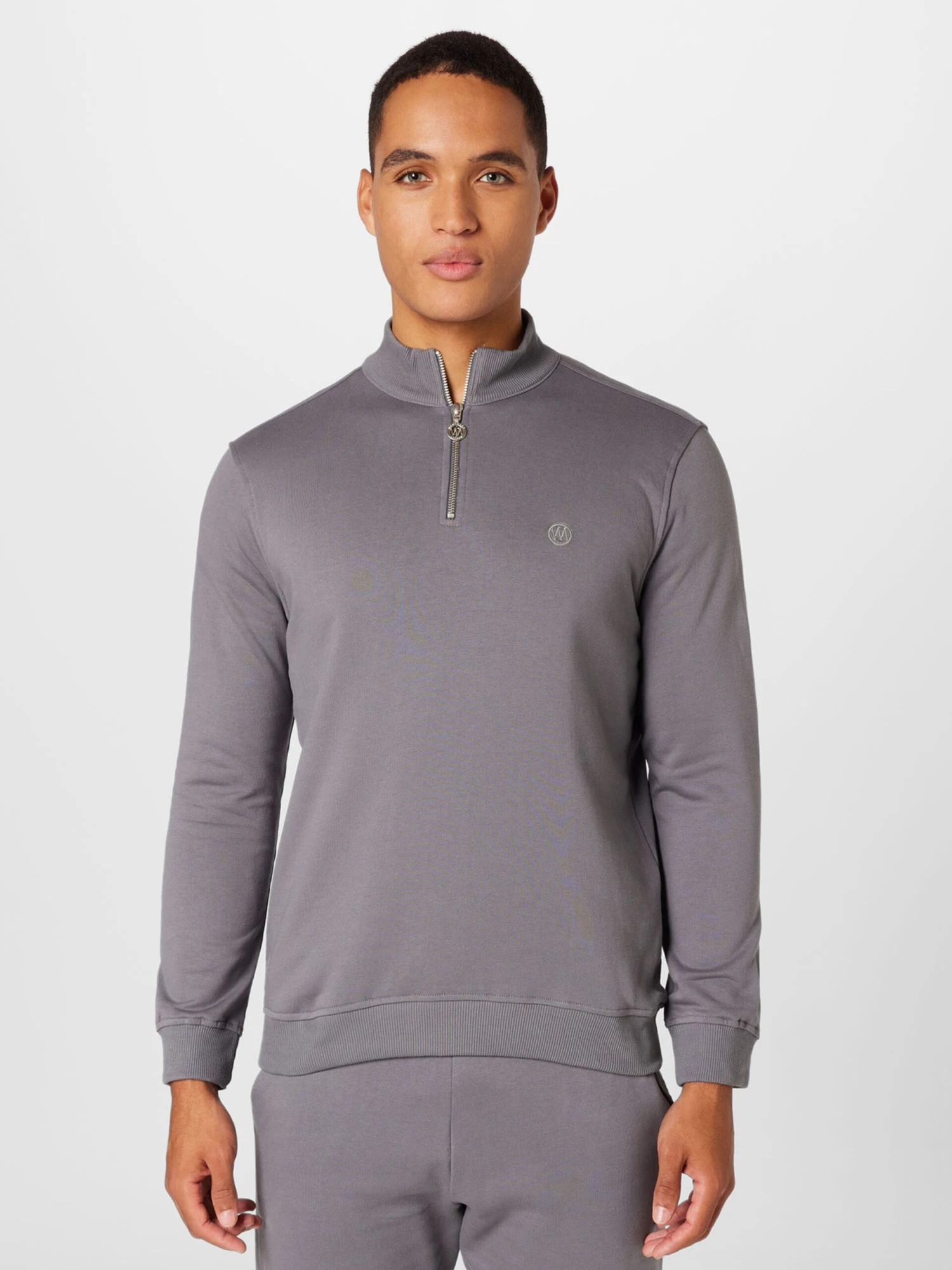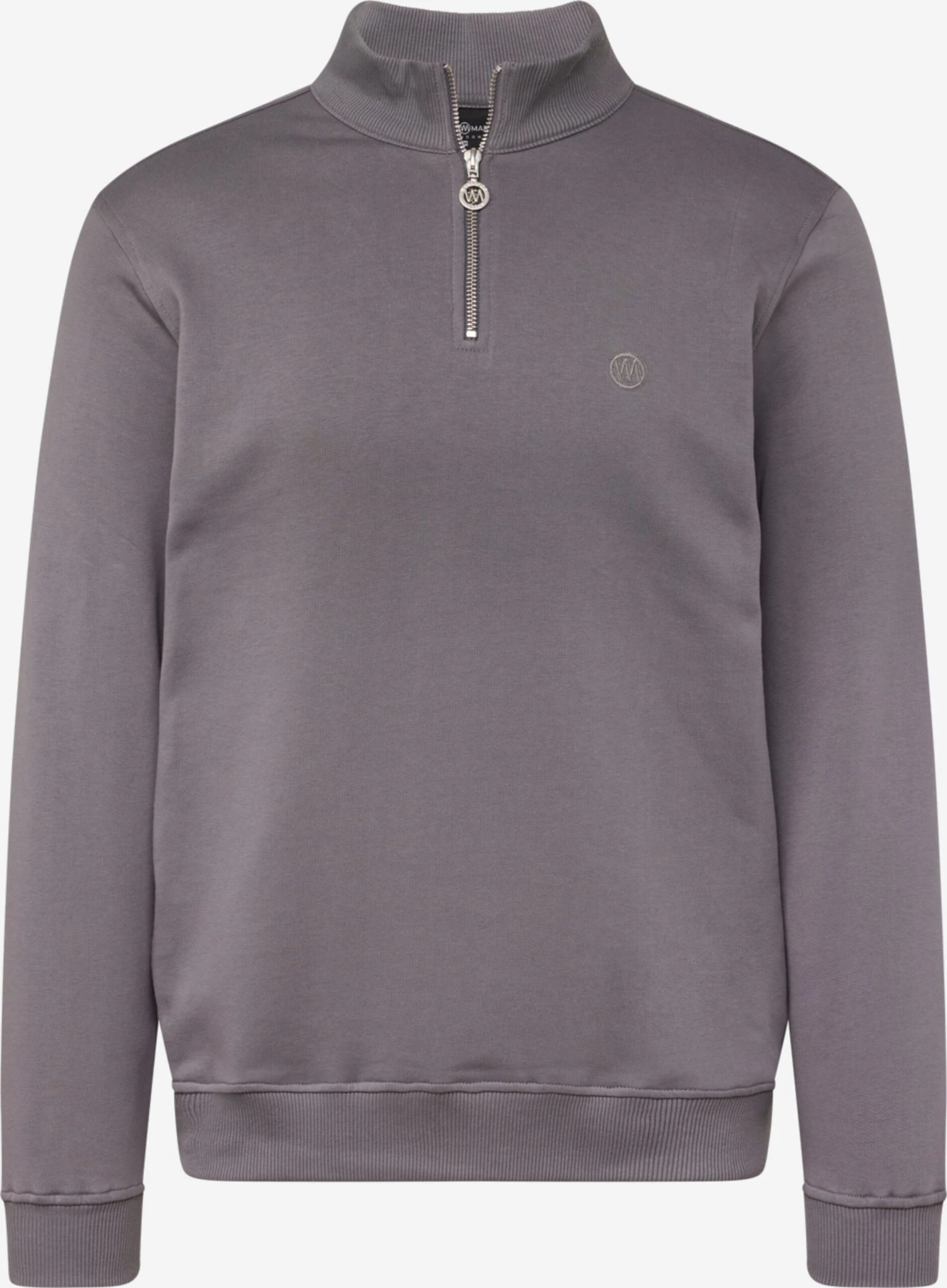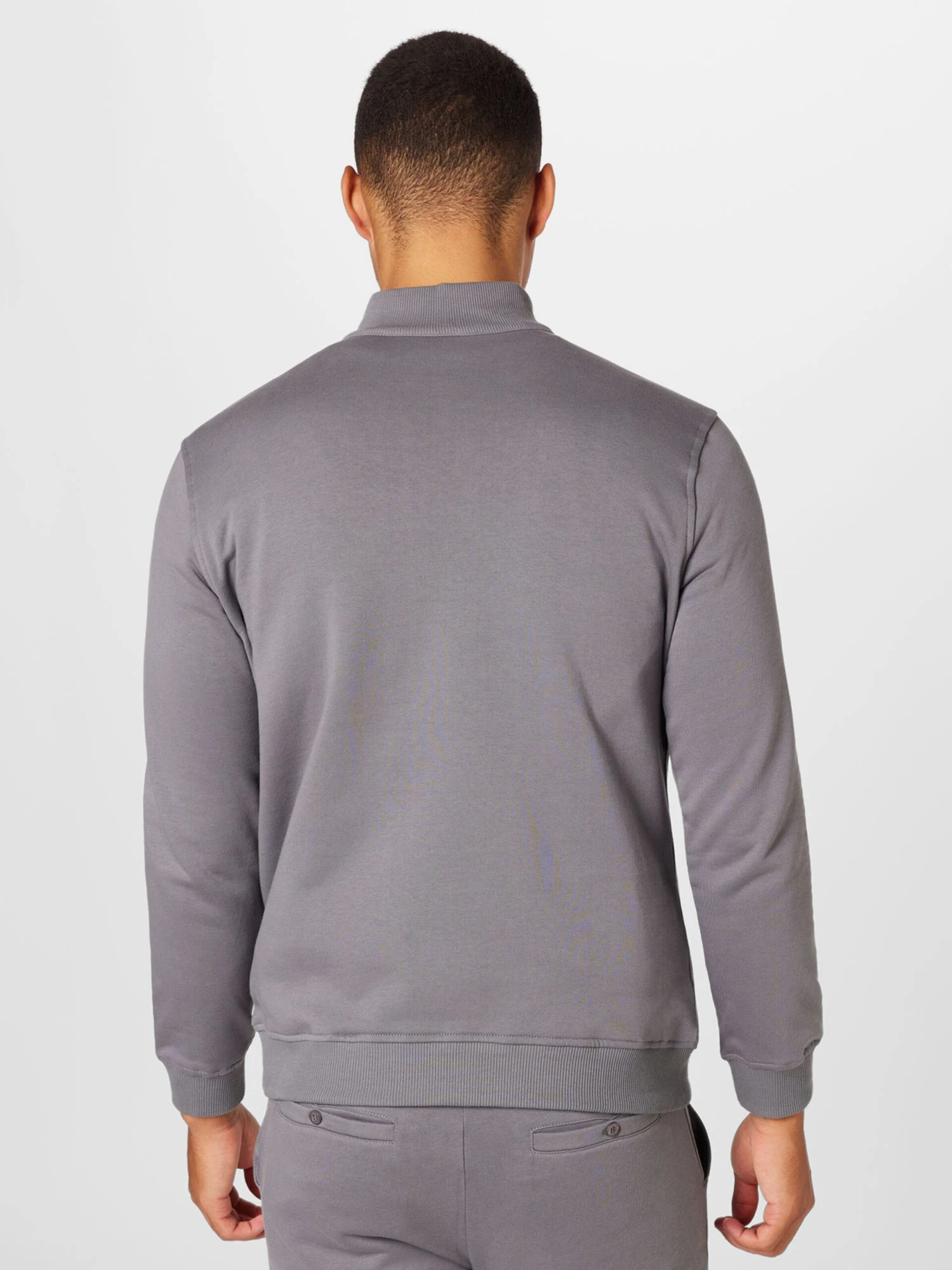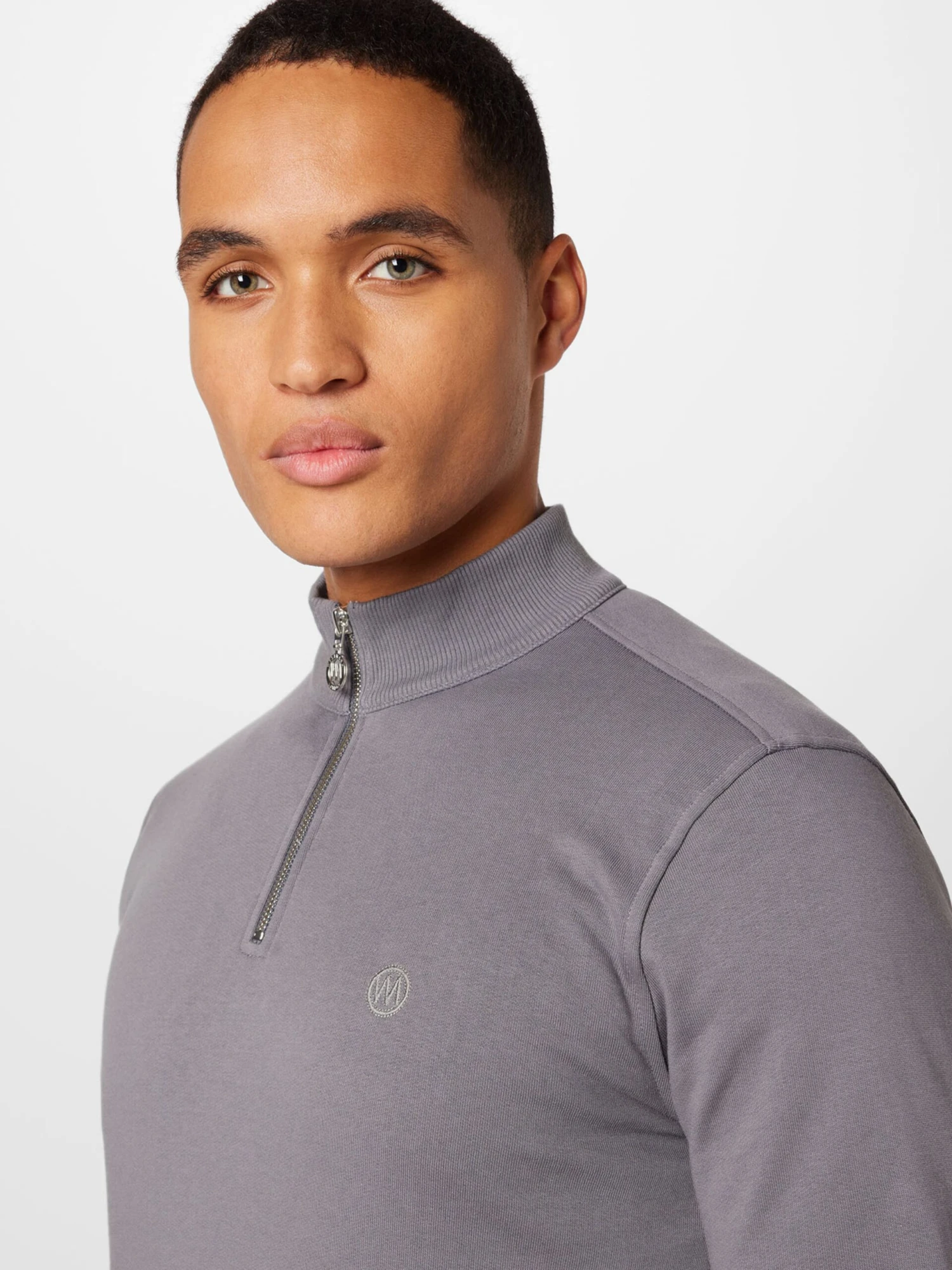 EffenSweatstofSchipperskraagGeribbelde kraagRechte zoomGeribd ceintuurtjeStaande kraagHalve ritsLabel borduurwerkOp staal nadenVoelt zacht aanRitssluiting